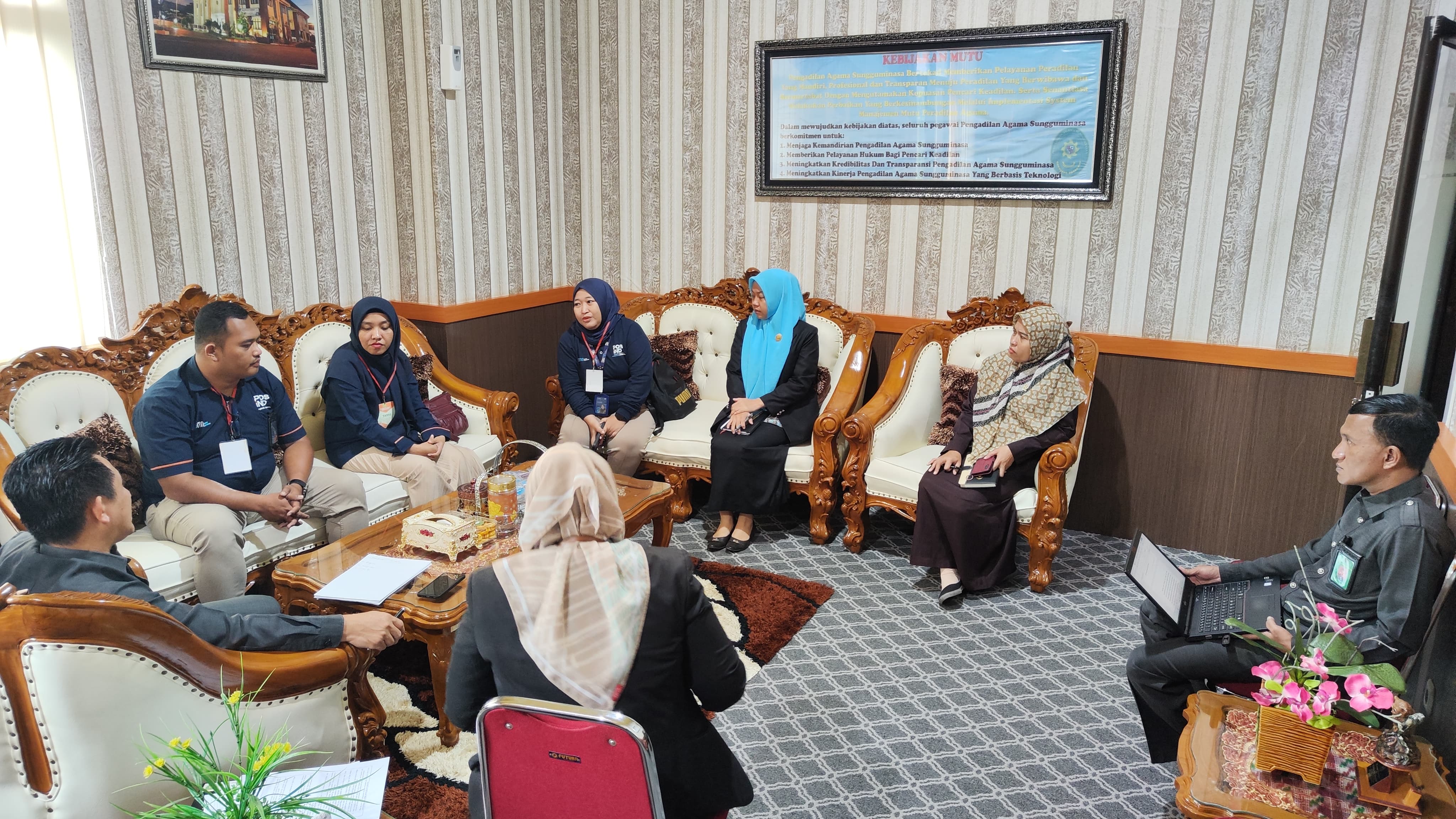 Sungguminasa - Selasa, 21 Januari 2025. Ketua Pengadilan Agama (PA) Sungguminasa, A. Muh. Yusri Patawari, S.HI., M.H., beserta Jajaran Hakim dan Panitera mengadakan pertemuan dengan jajaran PT. Pos Indonesia Kabupaten Gowa di ruang kerjanya. Pertemuan ini bertujuan untuk memperjelas hasil monitoring dan evaluasi (monev) yang dilakukan pada Jumat, 17 Januari 2025.