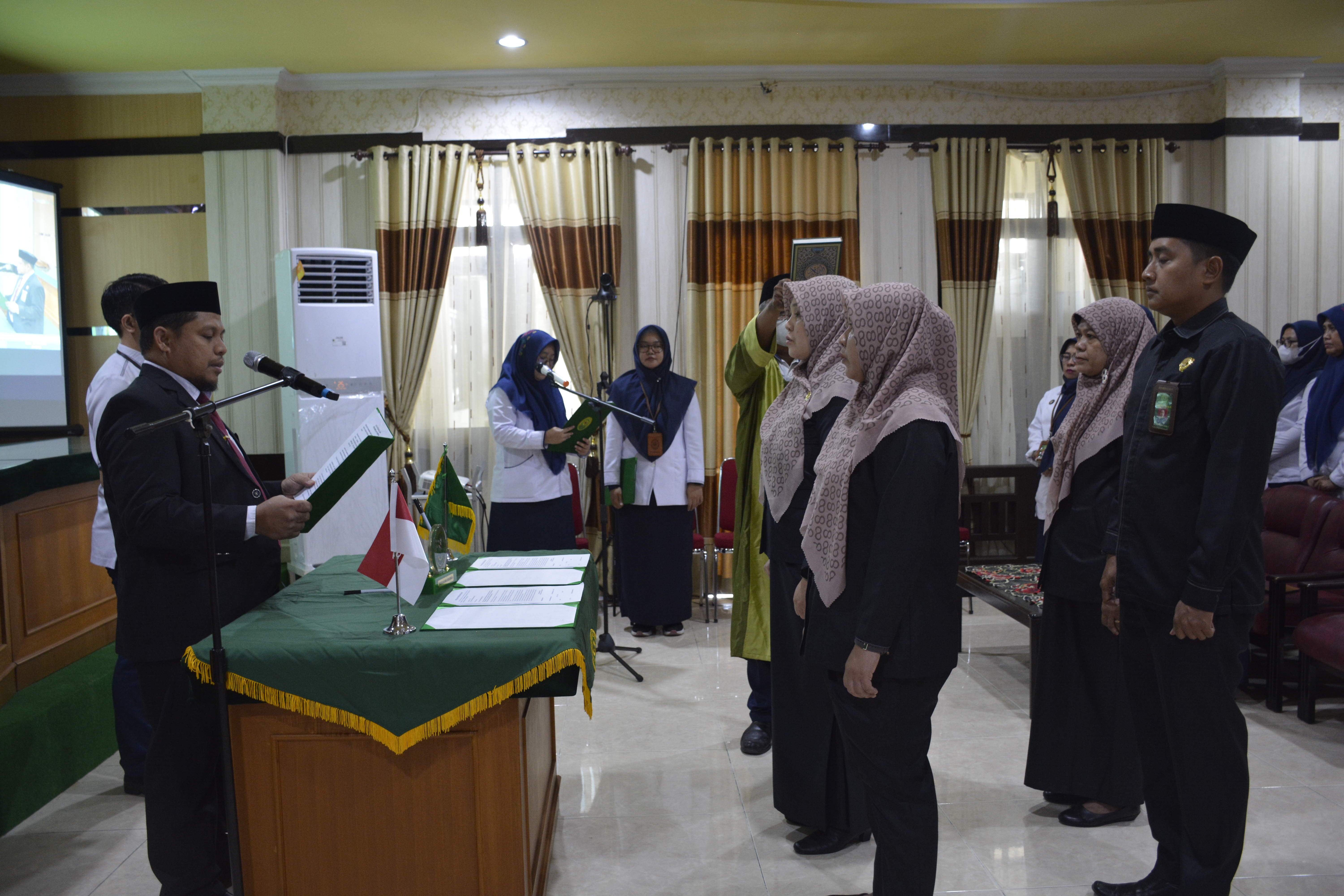 Sungguminasa – Senin, 22 Mei 2023. Menindaklanjuti Petikan Keputusan Sekretaris Mahkamah Agung RI Nomor 473/SEK/KP.1/SK/IV/2023 tentang Promosi dan Mutasi Pejabat Struktural Pengadilan di Lingkungan Mahkamah Agung, dilaksanakan Pelantikan dan Pengambilan Sumpah Jabatan Kepala Sub Bagian perencanaan, Teknologi Informasi dan Pelaporan (PTIP) Pengadilan Agama Sungguminasa Kelas IB, Ibu Andi Suryani Mattupuang, S.Kom. Sekaligus dilaksanakan pula pelantikan dan pengambilan sumpah jabatan fungsional Analis Pengelolaan Keuangan APBN Ibu Mulyani, S.E. berdasarkan Petikan Keputusan Sekretaris Mahkamah Agung RI Nomor 475/SEK/KP.1/SK/IV/2023 tentang Pengangkatan Melalui Perpindahan dari Jabatan Lain ke Dalam Jabatan Fungsional Analis Pengelolaan Keuangan Anggaran Pendapatan dan Belanja Negara.