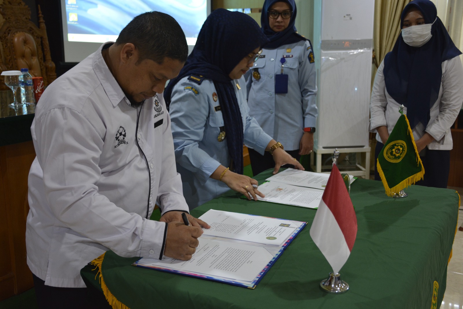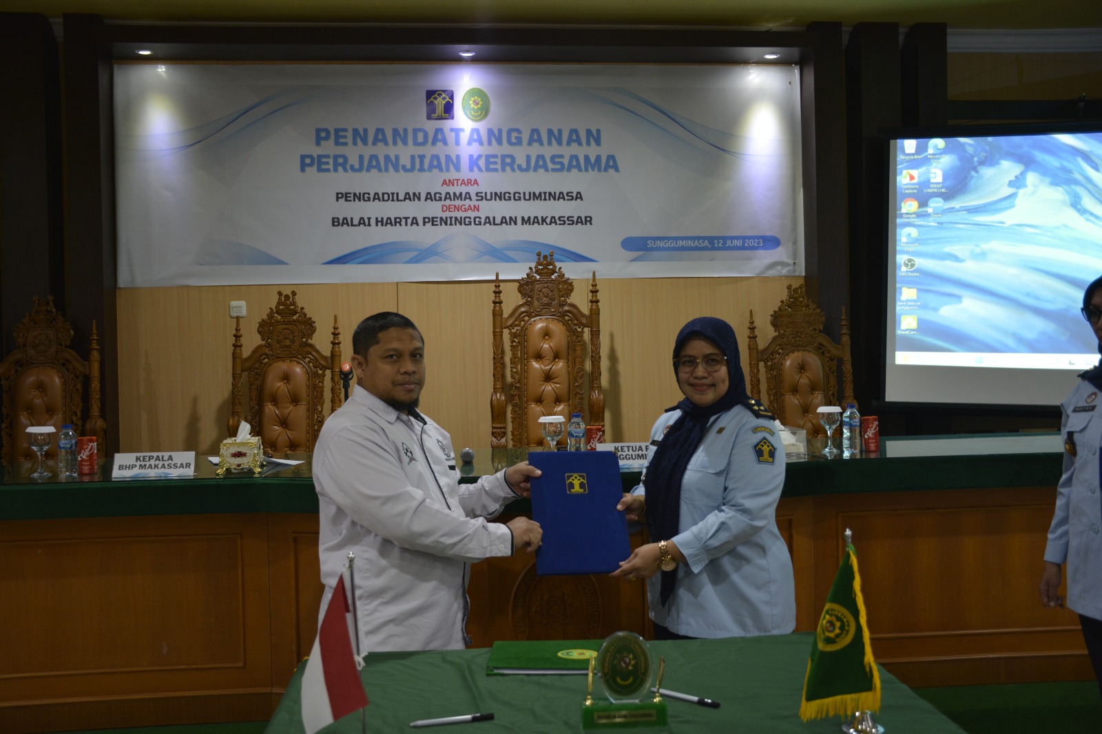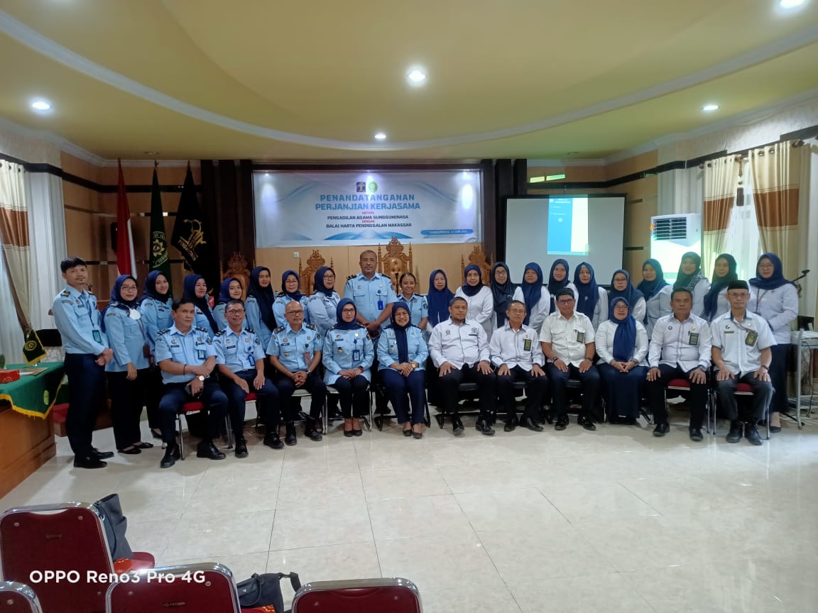 Sungguminasa - Senin, 12 Juni 2023. Pengadilan Agama Sungguminasa telah mengadakan Perjanjian kerja sama dengan Balai Harta Peninggalan Makassar Kantor Wilayah Kementerian Hukum dan Hak Asasi Manusia Sulawesi Selatan, acara penandatangan hadiri oleh Ketua Pengadilan Agama Sungguminasa (Dr. Mukhtaruddin Bahrum, S.HI.,M.H.) dan Plt. Kepala Balai Harta Peninggalan Makassar Kantor Wilayah Kementerian Hukum dan Hak Asasi Manusia Sulawesi Selatan (Utary Sukmawati Syarief, S.E.,Ak.) diikuti oleh jajaran Kepaniteraan Pengadilan Agama Sungguminasa serta Jajaran dari Balai Harta Peninggalan Makassar.