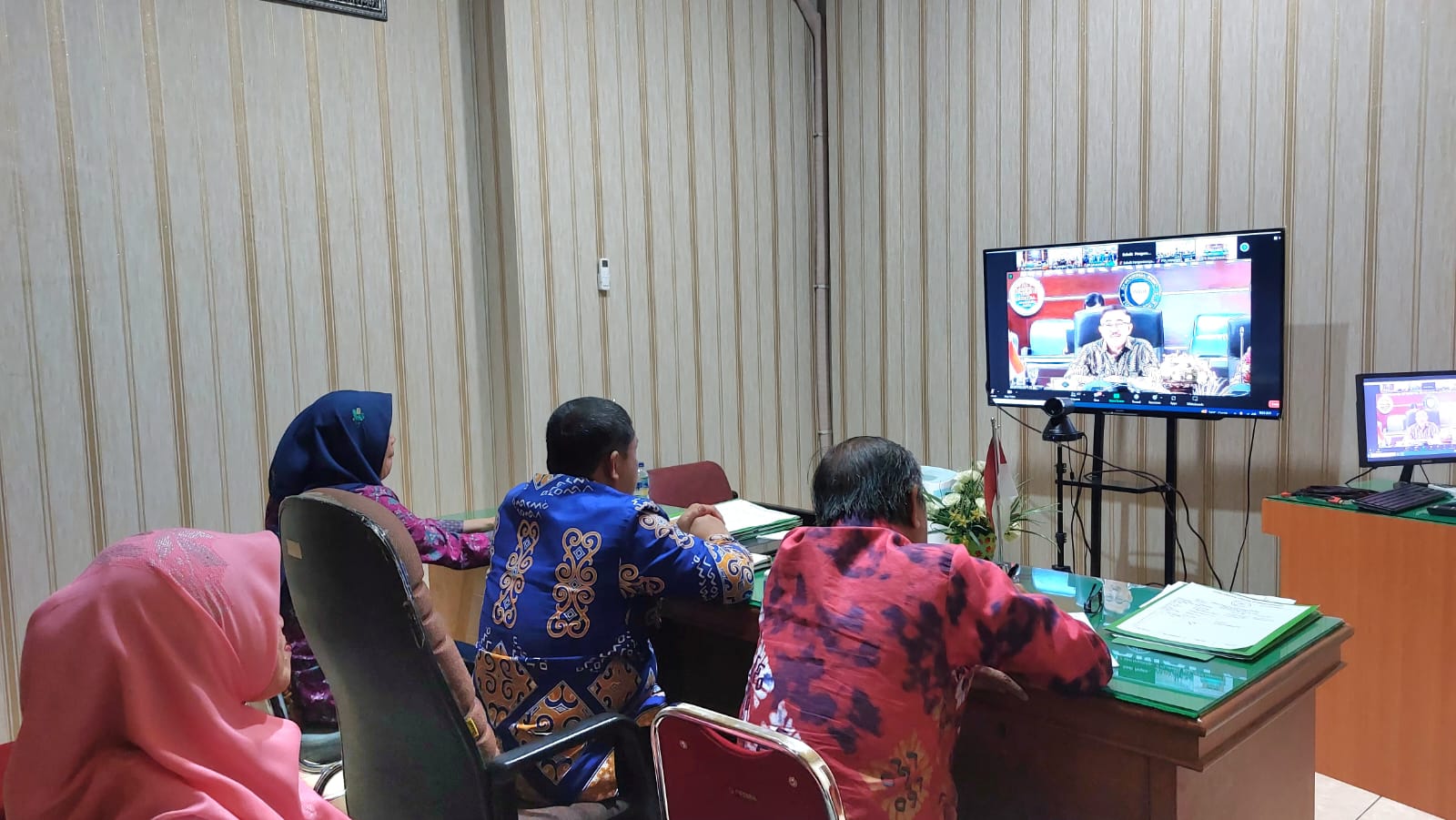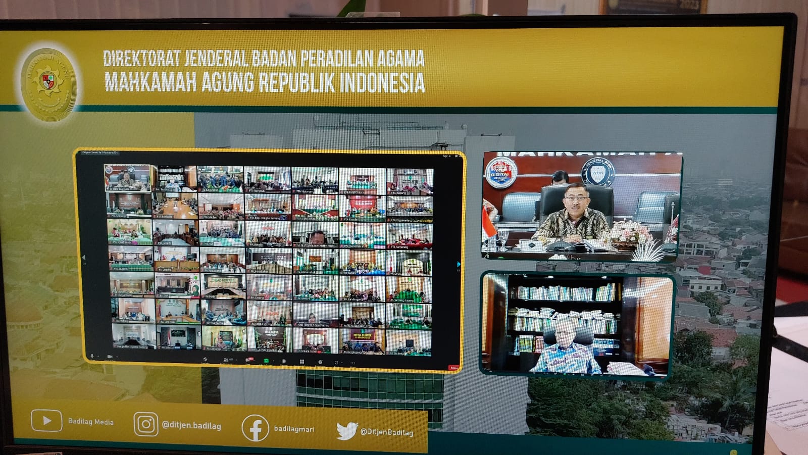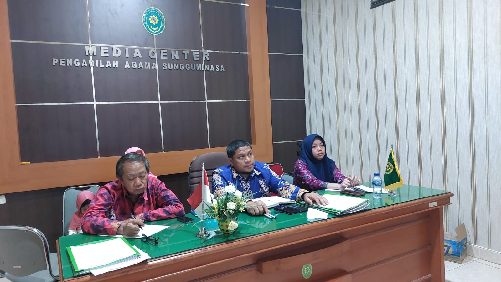 Sungguminasa - Jum'at, 14 Juli 2023. Ketua Pengadilan Agama Sungguminasa (Dr. Mukhtaruddin Bahrum, S.HI.,M.HI) dan Jajaran Hakim mengikuti Bimtek Kinestetik Hukum Acara Perdata (Telaah Temuan Penerapan dalam Berkas Kasasi dan Peninjauan Kembali) secara daring pelaksanaan dilaksanakan diruang Media Centre, acara Bimtek ini disiarkan melalui Youtube Badilag TV.