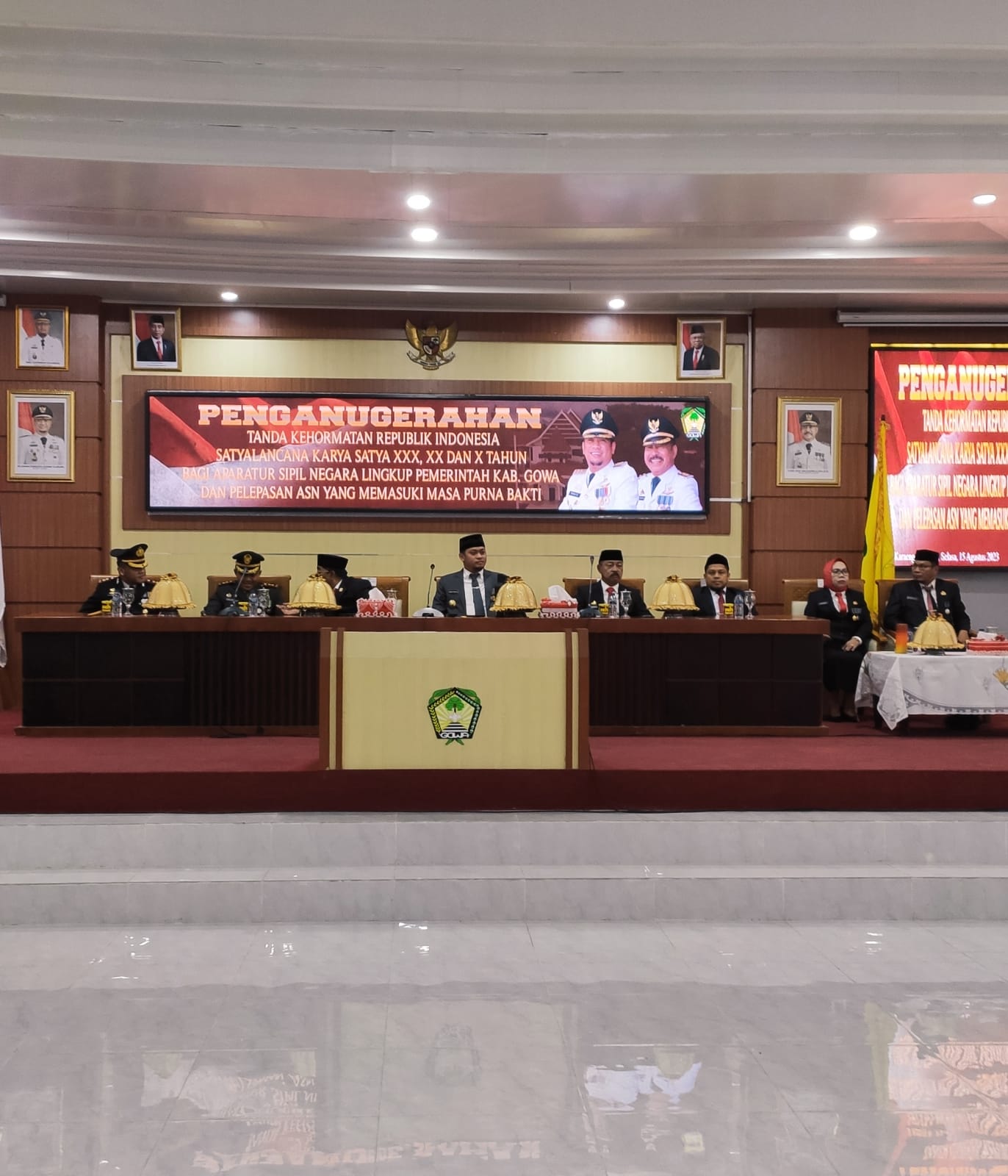 Sungguminasa - Selasa, 15 Agust 2023. Ketua Pengadilan Agama (Dr. Mukhtaruddin Bahrum, S.HI.,M.HI) dan beserta jajran forkopimda Kab. Gowa menghadiri acara Penganugerahan Tanda Kehormatan RI Bagi ASN Pemkab Gowa dan Pelepasan ASN yang Memasuki Masa Purna Bakti yang diadakan di Baruga Karaeng Galesong. Penganugerahan ini diberikan kepada ASN yang telah menunjukkan kesetiaan, pengabdian, kecakapan kejujuran, dan kedisiplinannya, serta bekerja terus-menerus sekurang-kurangnya 10 tahun, 20 tahun, dan 30 tahun.