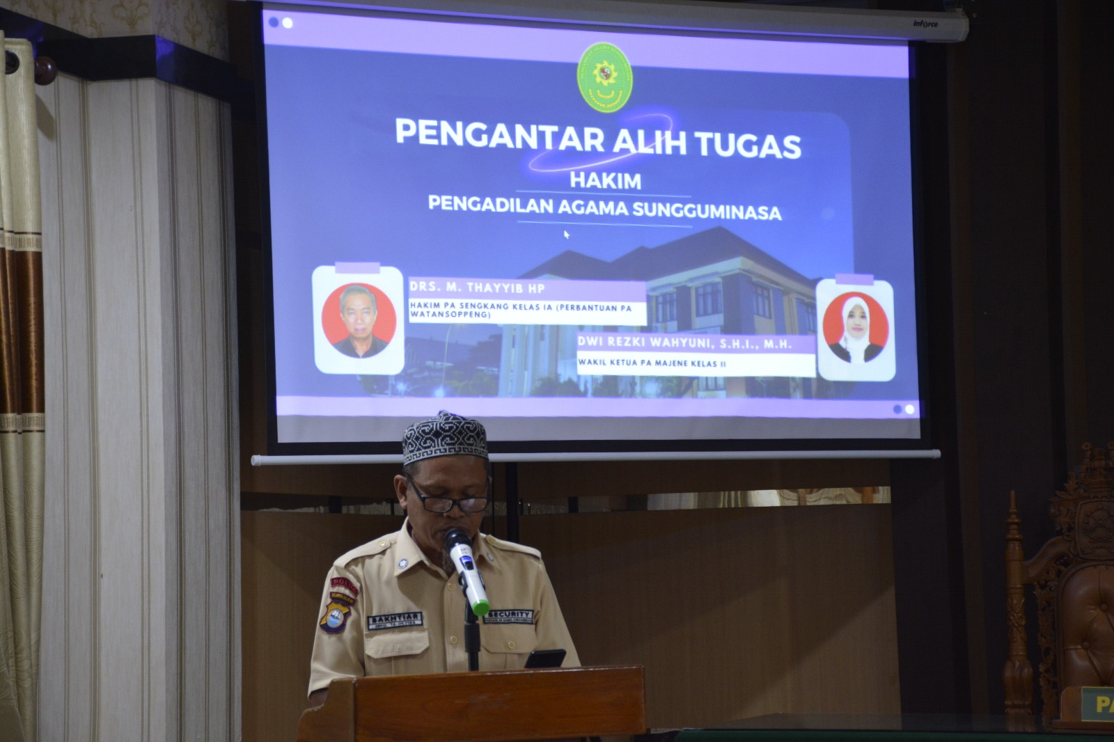 Acara alih tugas ini berlangsung dengan keharuan bagi seluruh pimpinan dan seluruh pegawai Pengadilan Agama Sungguminasa, Karena Drs. M. Thayyib HP merupakan hakim yang paling senior, beliau berkarir di Pengadilan Agama Sungguminasa sejak 14 Juni 2019. beliau berkarir selama 4 tahun di pengadilan Agama Sungguminasa membawa banyak kesan yang mendalam bagi masing masing pegawai dan juga beliau banyak memberikan kontribusi positif Pengadilan Agama Sungguminasa. Drs. M. Tahyyib HP akan bertugas di Pengadilan Agama Sengkang Kelas 1A sebagai Hakim.
