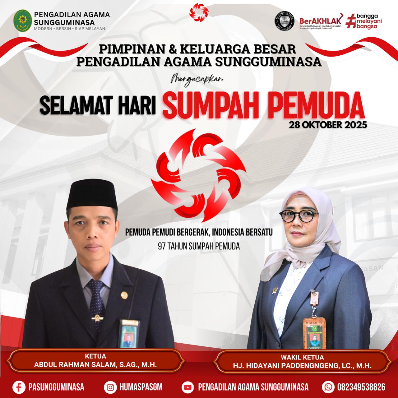 Ketua Pengadilan Agama Sungguminasa Hadiri Upacara Peringatan Hari Sumpah Pemuda ke-97 Tahun 2025 Sungguminasa - Selasa, 28 Oktober 2025 – Ketua (Abdul Rahman Salam, S.Ag.,M.H.) Pengadilan Agama Sungguminasa menghadiri upacara peringatan Hari Sumpah Pemuda ke-97 Tahun 2025 yang digelar di halaman depan Kantor Bupati Gowa, pada Senin (28/10/2025).
